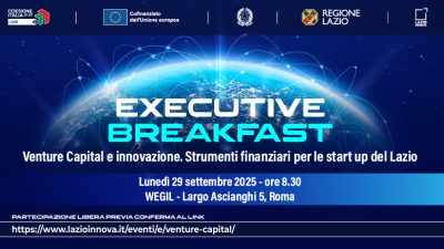Lunedì 29 settembre, a partire dalle ore 8.30, presso WEGIL in Largo Ascianghi 5 a Roma, la Regione Lazio organizza l’“Executive Breakfast – Venture Capital e Innovazione. Strumenti finanziari per le start up del Lazio”, un appuntamento promosso in collaborazione con Lazio Innova per mettere al centro il ruolo strategico del venture capital nello sviluppo dell’ecosistema regionale dell’innovazione.
