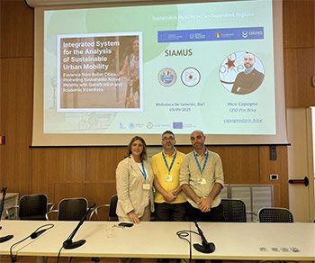 Nella foto: Conferenza "SIAMUS: Integrated System for the Analysis of Sustainable Urban Mobility" che si è svolta il 5 settembre presso la Biblioteca De Gemmis a Bari. Da destra: la professoressa Angela Stefania Bergantino dell'Università degli Studi di Bari, il professor Giovanni Circella dell'Università di Ghent e Nico Capogna di Pin Bike.